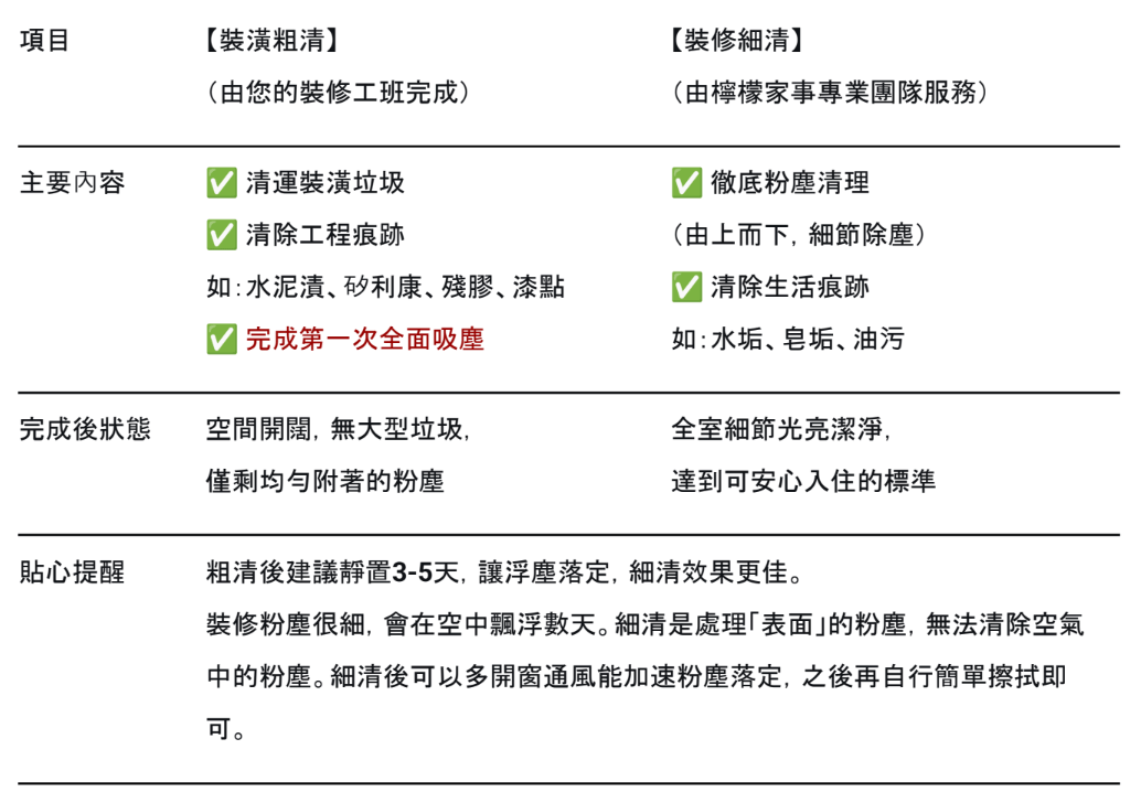 我們的「裝潢細清」核心是 「除塵」與「細節清潔」 ,旨在為您提供一個可立即入住的潔淨空間。 所有屬於裝修工程的「粗清」項目、高風險作業及專業設備拆洗,均需由相關責任方處理。