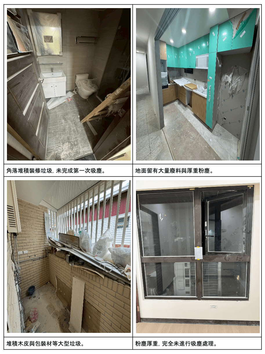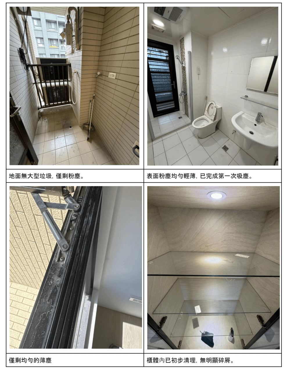 1. 粗清已完成:裝潢產生的大型垃圾、工程廢料已全數清運。